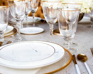 Available in: Dinner Plate 11″ Salad Plate 8″ Bread & Butter Plate 6″ Coffee Cup Pictured with: Celeste Flatware Gold Wire Napkin Ring