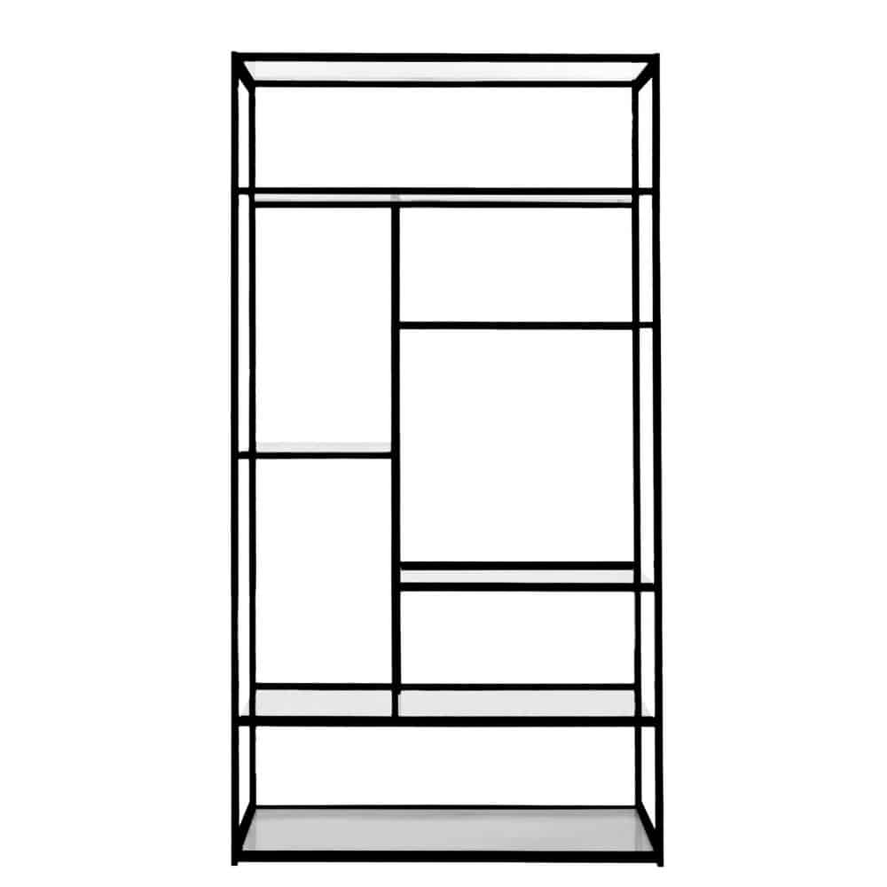 - Modern black metal frame with geometric shelving for a sleek, upscale look