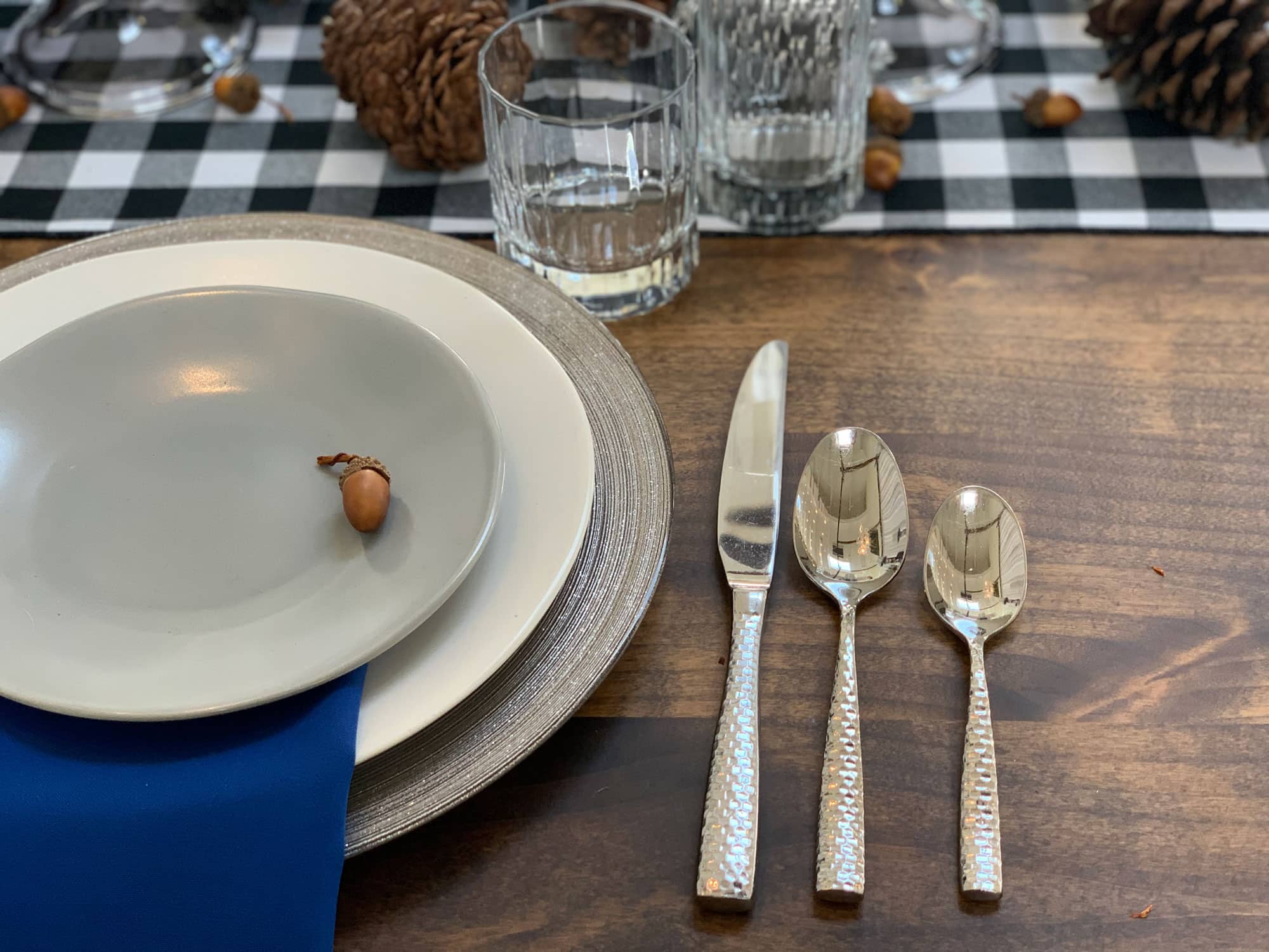 - Modern stainless steel flatware with a subtle hammered-style texture