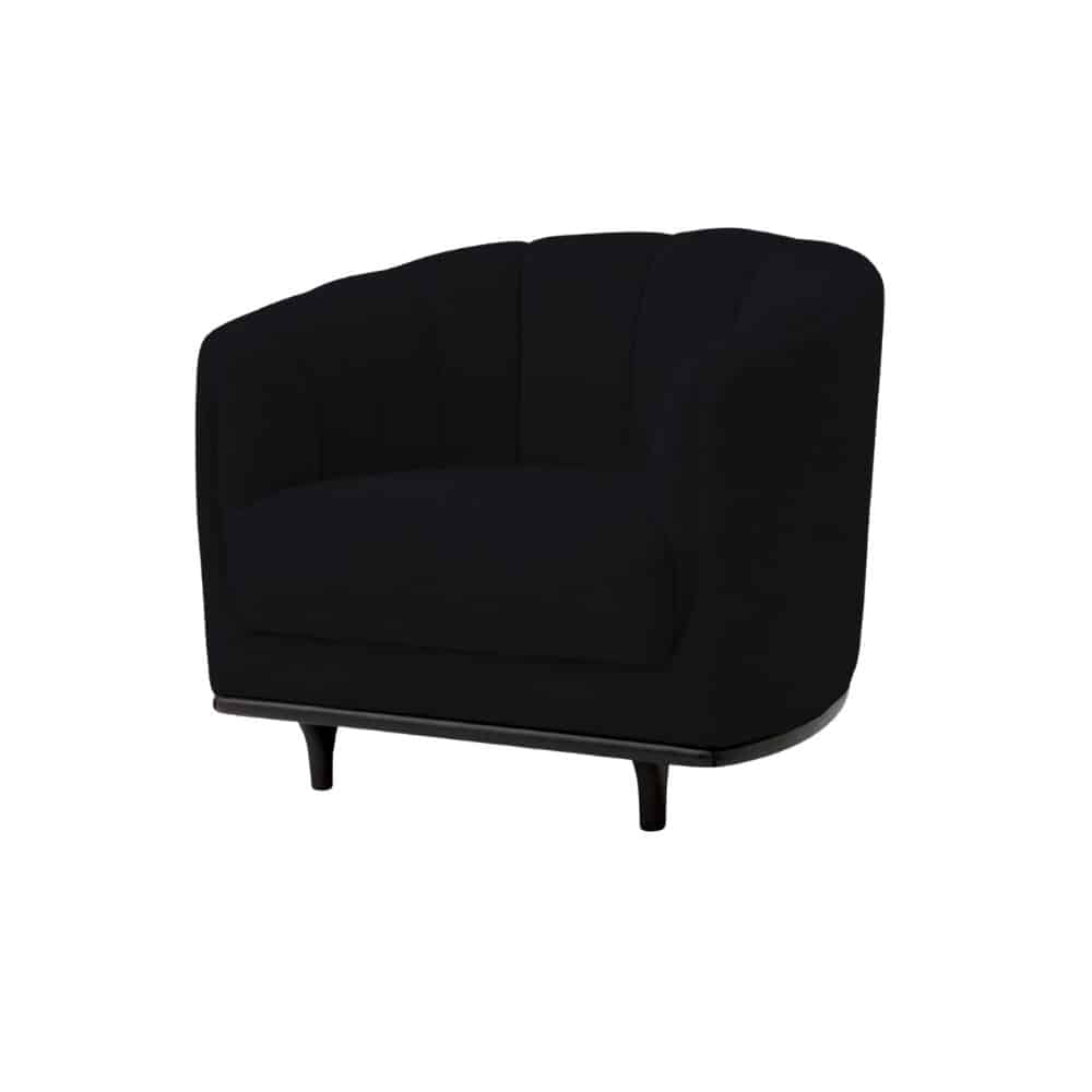 Sophisticated and sculptural, the Noir Lounge Chair brings modern glamour to any lounge or seating area. Upholstered in deep black fabric with a subtly fluted backrest and curved barrel silhouette, this low-profile chair creates a bold, moody statement while remaining versatile enough for minimalist, upscale, or contemporary event designs.