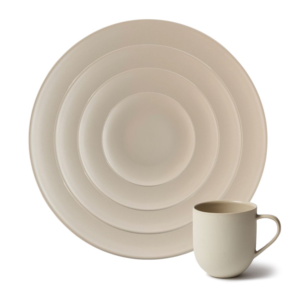 Each piece is crafted from durable stoneware with a handcrafted texture, offering a refined alternative to standard white china and an ideal base for layered place settings.