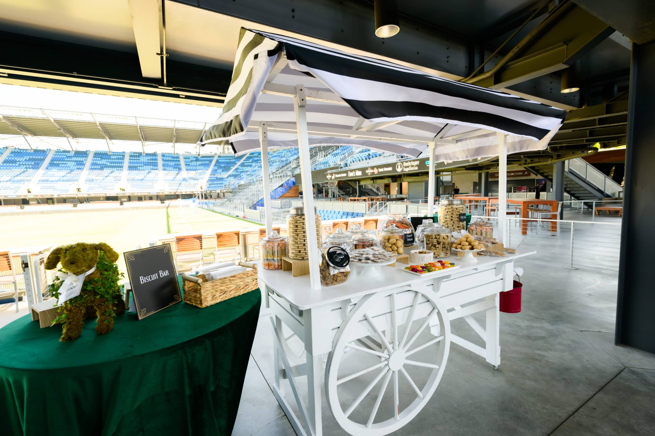 This cart functions beautifully on its own or can be upgraded with an optional scalloped canopy top for added visual impact. Custom canopies—featuring your branding, theme colors, or graphics—are available with sufficient lead time and an additional charge.
